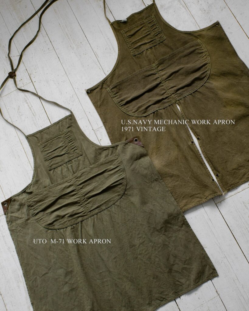 ヴィンテージの U.S.NAVY メカニック用ワークエプロンを元型に製作した、UTOの代名詞とも言える「M-71 WORK APRON」